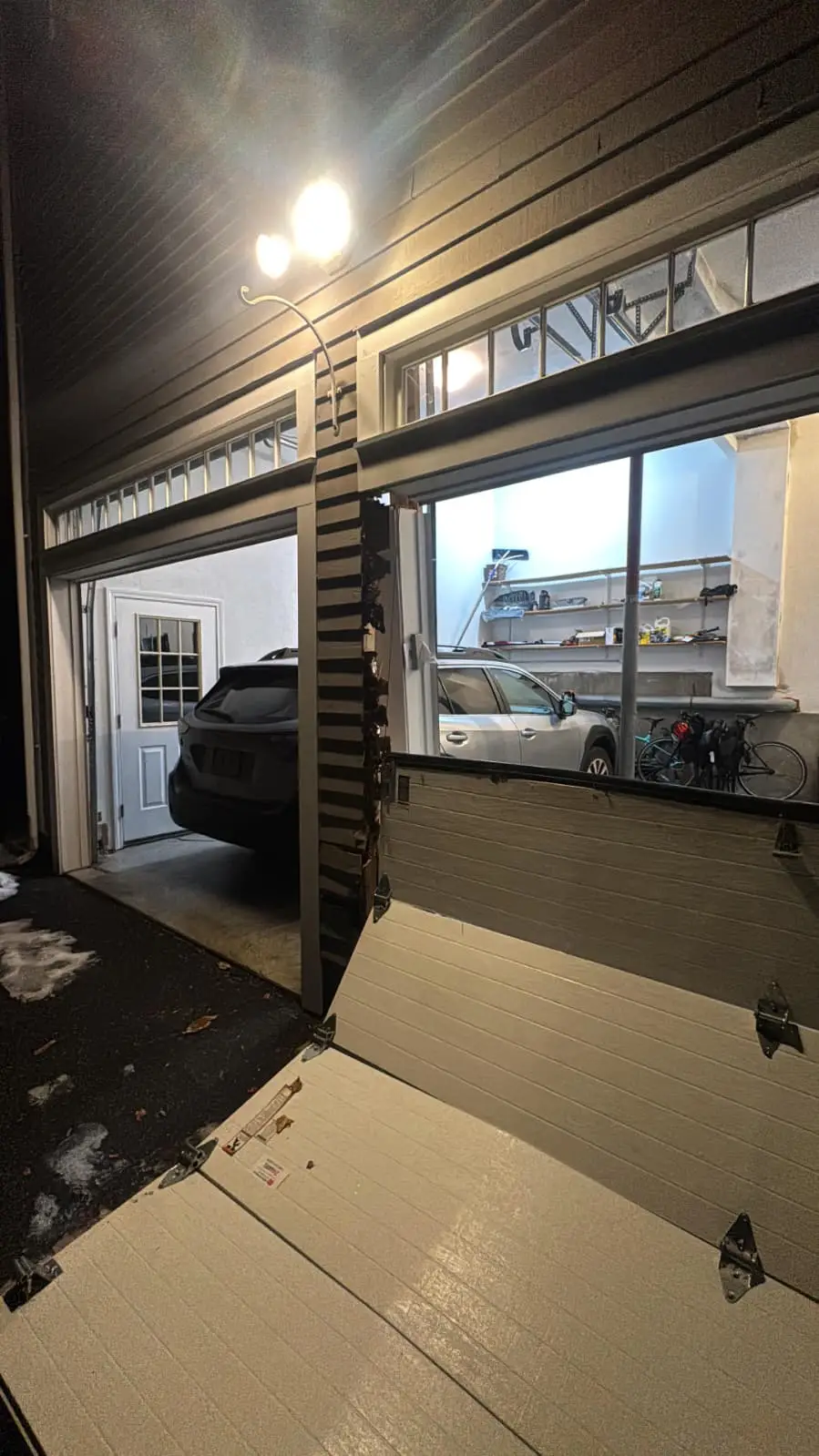 Garage door damage caused by a delivery truck impact before emergency repair.