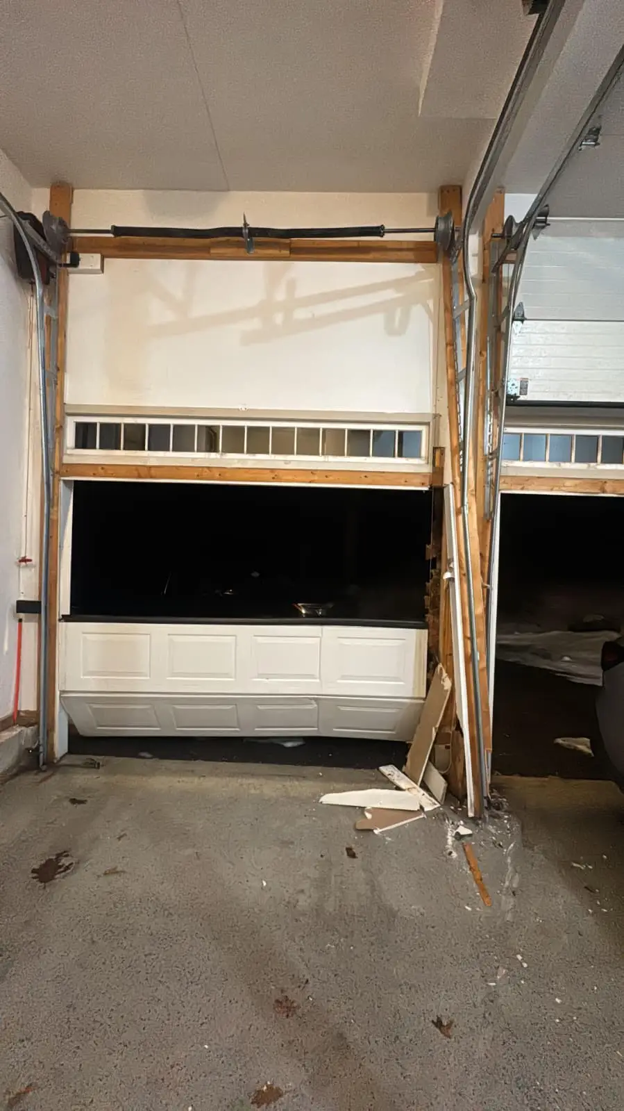 We received an emergency call after a delivery truck accidentally hit a residential garage door, causing severe damage and making the door unsafe to operate.